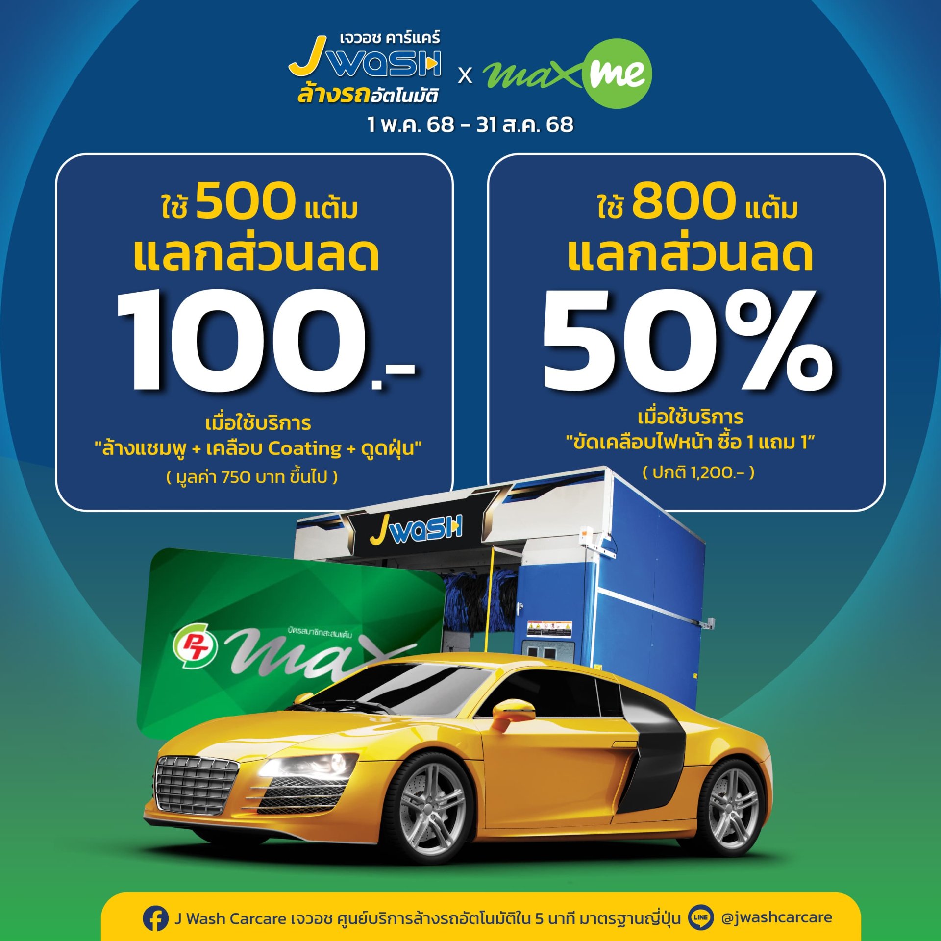J Wash Carcare ร่วมกับ MaxMe Rewards มอบสิทธิพิเศษให้ลูกค้าคนพิเศษแบบจัดเต็ม! แค่สะสมแต้ม MaxMe ก็สามารถแลกรับส่วนลดสำหรับบริการล้างรถที่รวดเร็ว สะอาด และได้มาตรฐานจาก เครื่องล้างรถอัตโนมัติ ที่ J Wash ทุกสาขาที่ร่วมรายการ